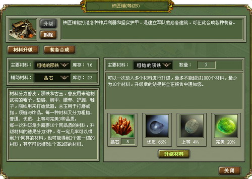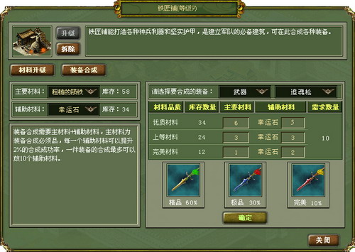 铁匠拥有材料升级、提高成功率等全新技术,幸运随时砸向你,10个低级材料炼制出1个高2级材料,辅助材料提高合成率高达20%,这些都不再是梦!你心中的兵器已经出世了吗?唯我独尊的时代已经到来,快给爱将打造神兵利器吧!
