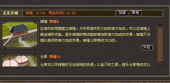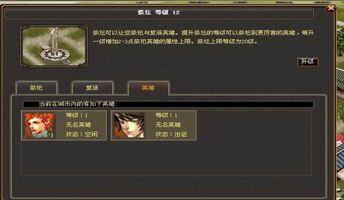 点击城市中的府邸,这里可以建设城墙,兵库等一系列的游戏资源,军事资源,游戏中的英雄也就是武将也是需要这里面的祭坛来创建出来。