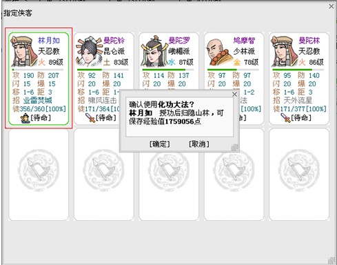 点击“确认”后,选中侠客被删除,道具“侠客手札”消失,获得绑定的经验道具“武学残篇”。