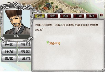 样?玩游戏还能笑笑,不错吧!在这小编只是截取了《江山多娇》中五大主城中的人物对白,相对于37座城池中所有NPC的对白,只有待玩家们细细发掘了.