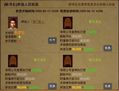 每天均有三个职位供各位大亨竞选,根据你公司的等级你可以竞选不同级别的职位,同时竞选成功后4天保护期内不会被弹劾.你可以通过提高自己公司等级、拉票等手段,让自由城里的大亨支持你竞选或者弹核对手,从而顺利坐上委员会的宝座.在任职期间,你可以行使与自己相应的一系列权利,包括禁言15分钟、颁发勋章、领取机要费、个人公司收入加成等特殊权利!