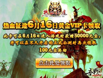 《热血征途》内测黄金VIP卡正在火热发放中,玩家可凭此卡在内测服务器中领取价值5000元大礼,帮助你快速实现征服天下的梦想.此卡内的激活码可获取公测100元宝奖励,请各位玩家妥善保管.官方发放黄金VIP卡正在进行中,数量有限,机不可失!