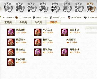 传说有一种鸟叫“毕文”,其状如鹤,一足,赤文青质而白喙,会吐火而引起火灾,使得对方城市的粮食部分被烧毁。“毕文之火”谋略道具就是以此为原型,使用这个道具能使得对方城市的粮食减少,造成最大50%的粮食损失。石料是城市发展的重要资源,你可以派人潜入敌人的城市中,将化尘秘药撒入对方石料仓库,使得对方城市的石料部分被毁,最多可以造成最大30%的损失,这便是“秘药化尘”道具的作用。