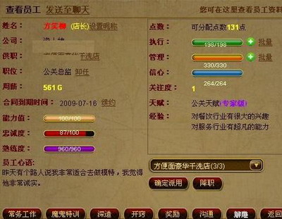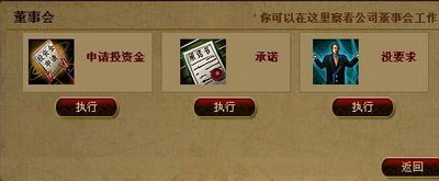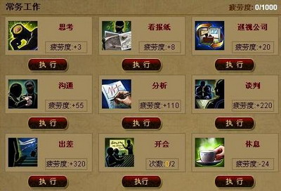 来之不易的创业成果,必须要用心去经营才能长久,成功的道理是永恒的,就是找对方向,勤奋努力。了解公司信息,进行相关的公司规划,常规的思考可以让你的商道增值、看报纸能让你把最新的商业信息掌握其中、巡视公司会让命令更加执行到位,至于沟通、出差、谈判等作为CEO必须做的工作,有时也会被许多的人所忽视。《商业大亨》里的常务工作设置是比较合理的,在概括了全面的经商之道的同时又不失游戏的乐趣。