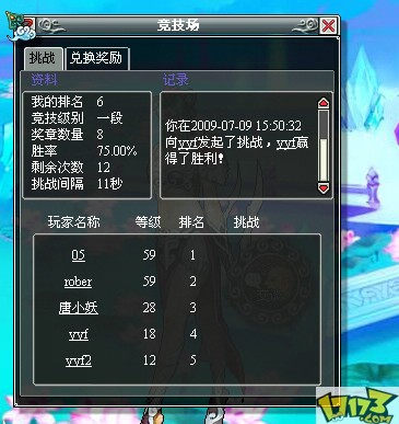 玩家点击功能按钮竞技场或使用快捷键“A”可打开竞技场界面,点击“挑战”按钮即可与对应的玩家进行PK。