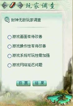 再看看这个“玩家调查”和“客户服务”栏目,如果你有对封神有更好的建议,或者是有什么不满意的,或者是你觉得封神需要改进的地方的,现在你可以通过它们二个栏目来满足你“有苦没处说”的难题,让封神更加贴近玩家,做玩家最满意的游戏,让玩家最大限度的玩出自己的精彩!!!!!