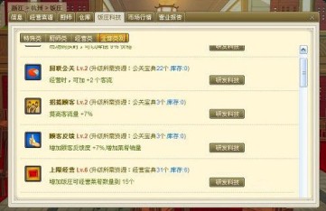 饭庄经营的重点有两点,饭庄科技的提升顺序和菜肴经营。在饭庄科技的升级方面,首先要以提升上限经营为主。上限经营的级数越高,就能经营越多的菜肴。而每道菜肴的销售量达到一定的数值,就会获得一定的声望。因此,饭庄能够经营的菜肴数量是非常重要的。另一个升级的重点主要在经营类上,经营类的提升会获得更大的客流量,和菜肴销量,对于声望的提升有较大的帮助。