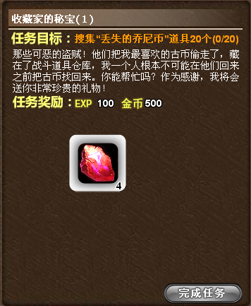 亲爱的各位达人《弹弹堂》 玩家们,在经过7月18日的更新后,是否发现《弹弹堂》新版中出现了许多惊奇的变化呢?其中,在玩家日常任务中,多了一个“收藏家的秘宝”任务呢!呵呵,这就是我们为各位弹弹玩家们带来的惊喜,去通过战斗寻找“收藏家的秘宝”吧,成为《弹弹堂》的“夺宝奇兵”吧!