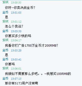 看了这则广告,我想骗子大概都是拿贪小便宜的人开刀的,于是我扮演了这个贪便宜的家伙,加了他的QQ聊天,问他是不是1700万金币只要200元人民币。