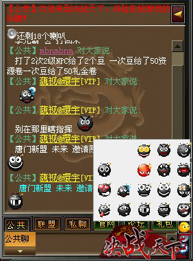 在很多webgame里,聊天系统基本大同小异。而《决战天下》虽然也同样分为公共频道、联盟频道和私聊频道,但是却可以在聊天文字中插入可爱头像的表情,让你的话语传达出丰富的情感内容。