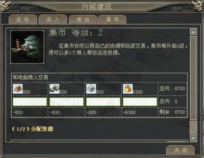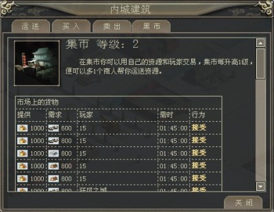 《明1644》里驿站、贸易榷场、军需马道会随等级提高商人的运载量和行动力,每升1级关联属性都将提高10%,当“集市”20级的时候所属商人的运载量和行动力提高300% 。在集市内还可以使用“运送资源”、“买进”、“卖出”、“黑市”等内容操作项。