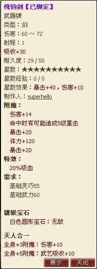 自从有了福袋,大家都提前奔了小康,满大街工布剑,此等怀旧武器已经很少见。他的武器名不经传,属性不如4暴倍4重击那样惹人羡慕,但他的战绩让我们眼前一亮,2暴击——战斗中的神来之笔,1体力——战斗中稳稳步向对手,重击+伤害——稳定的输出流。每一种附魔都很普通,但拿在他的手里就是那样的不普通,这位老外兄弟名字也一样不普通!