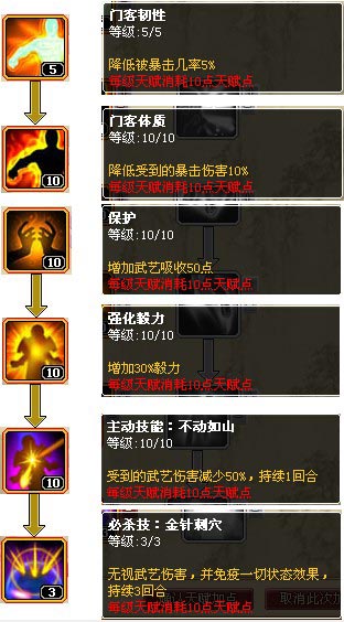 为了追求高闪避,我直接放弃了第2排的天赋,把第一排的“门客身法”和“枪系掌握”点满,接下来把下面图里的点满,之后剩下的就随便你点些什么了。