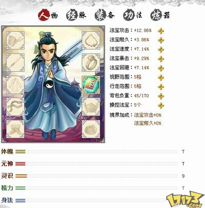 玄天录是以玩家和法宝的共同修炼为主,下图主要的信息就是玩家能力属性和法宝属性,详细的告诉你法宝的攻击数值等。游戏中法宝是要不断修炼,同时每用一次都会减低耐久所以玩家要经常注意修理。法宝在玄天录中是占有很主要的地位。