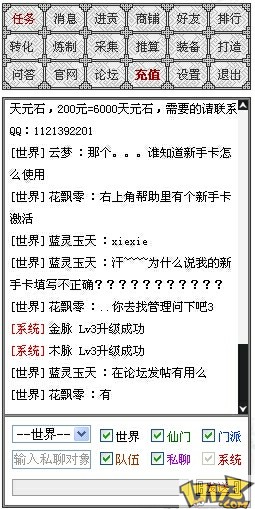 游戏主界面分为四大区块,左为人物属性,其中包含,人物等级,金钱,游戏币,人物经验,当前人物状态等信息。