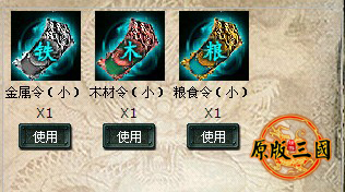 战事来临,前方八百里加急快报不断送入朝中。国中粮库空虚,各种资源都开始吃紧。购买资源也只是缓兵之计,解决其根本方法是要立即增加各资源产量!这时,《原版三国》中各种资源令就派上大用场了。不同的资源令可在24小时之内提升30%~60%的单位资源产量!