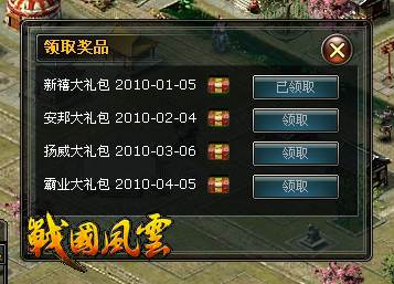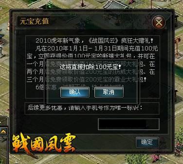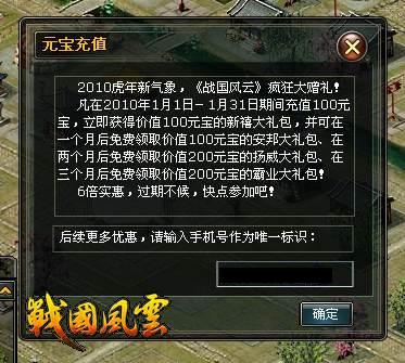 其中新禧大礼包价值和安邦大礼包分别价值100元宝,扬威大礼包和霸业大礼包则分别价值200元宝,总价600元宝豪华礼包,只要10块钱就能获得。花最少的钱,买最多的道具,叫人如何不心动?据悉充100送600的活动将到春节前截止,大好机会千载难逢,各位贤君明主是否已经拨好心中的算盘了呢?那就快快参加战国风云超值返利活动吧!