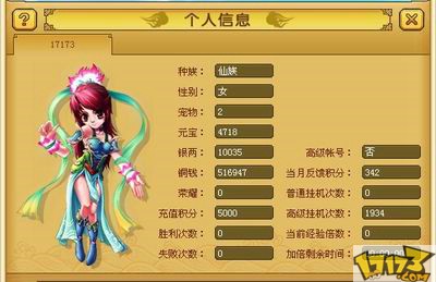 ·人物 显示人物的基本信息金钱,挂机次数等。