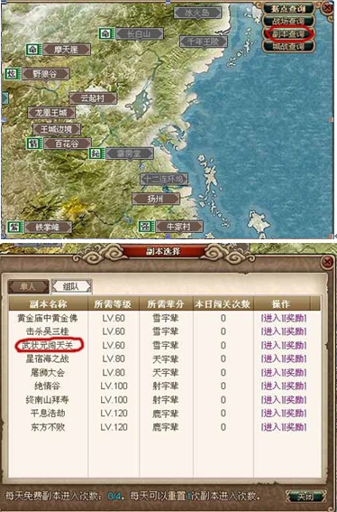 玩家进入游戏后点击世界地图的右上方“副本查询”,然后直接选择“武状元闯天关”副本。值得注意的是,要进入《武侠风云》全新苏乞儿副本的玩家必须达到60级以上,并且组队之后才能进入。