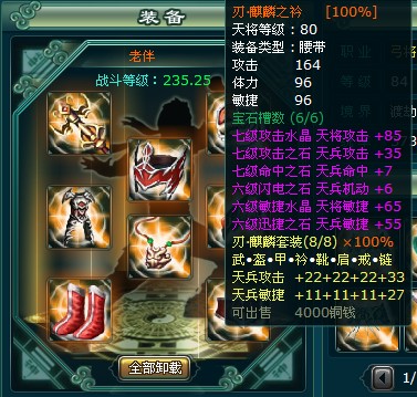 别忘了通过锻造石提取的属性添加到这些装备上,固套添满抗性上限的情况下堆防;灵套不用多说,自己堆敏;而刃套则多重选择了,在命中足够的情况下堆攻或连都是不错的选择,具体怎么选择,智者见智了。