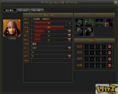 船长还有战船、炮战、舷战、统筹四系特长,分为S、A、B、C、D、无6档,分别提升对应舰队生命和减少粮食消耗。