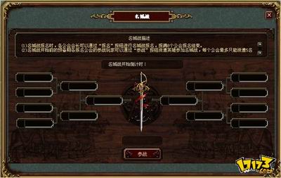 公会可以参加名城战,每个文明有4个用来争夺的名城。名城战采用报名淘汰制的战斗形式,每个会员都可以派遣自己的一个英雄进入本公会对决候选名单,公会在对决候选名单中选出5人战斗。名城战胜利的公会可以拥有名城,定时获得名城的资源。