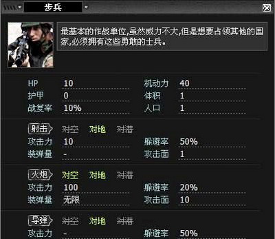 游戏中,任意兵种都有相应的对陆、对海、对空属性,除此之外,战复率、躲避率等属性更是考验玩家的搭配和经验.常见的人海战术可能发挥不出应有的效果,按照对手的兵种搭配,配比最合适的兵种和武器,才能获取战争的胜利.正所谓:知己知彼,才能百战百胜.