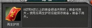 在经过多次锻造时候当装备等级到达8级的时候,如果你还想往上提升,这时候要注意了。8级以前锻造失败只会降低装备等级,但达到8级之后,锻造时候的时候装备有一定几率损坏直接消失。万一装备消失了,那可就得不偿失了。所以这个时候就要使用再生神符来防止装备因锻造而损毁以至消失。再生神符的价格和保护神符一样,非常便宜。
