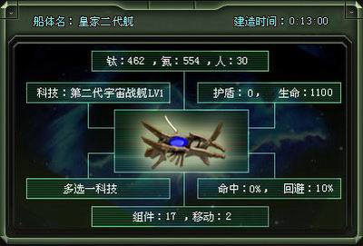 建造所有资源:钛:473 氦:315 人:157;船体信息:护盾:150 生命:1400 组件:18 移动:0 命中:10% 回避:10% ;科技需求:轻型舰理论LV5 ;任务科技5 LV1 ;建造时间:0:13:00。