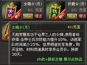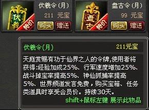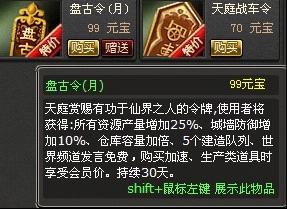 目前《封神无敌》中有着三种VIP道具,分别是盘古令、伏羲令、女娲令,可以为广大玩家提供以下三种福利。