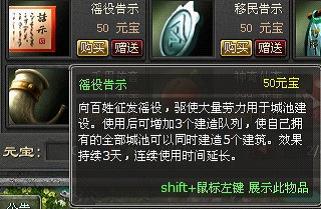 接下来是曾经的商城宝物之星——徭役告示,可以同时拥有5个建造队列持续三天并且效果覆盖所有城池。一般城池只能拥有2个建造队伍,使用徭役告示可以增加3个建造队伍,是一般的1.5倍,大大的提高了主城建造的速度。