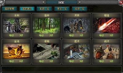 游戏在国家系统按照战国的官阶和文化而定,加入了国家管理、国家竞选、诸侯分封、官职任命以及国家建设等特色系统,使国家真正成为玩家为之奋斗的目标。通过国家系统可以完成整个国家的管控,民心的凝聚,命令的下达,共同理想的实现一个国家的强盛必定的所有的国人万众一心、众志成城的结果!