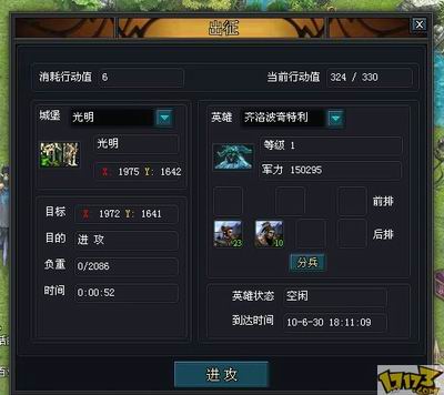 在选择进攻以后玩家需要选择自己英雄进攻,同时页面上也会显示英雄等级,军队数量,和到达时间。