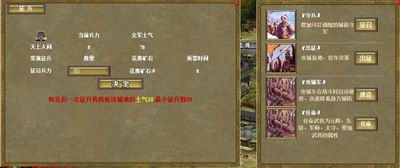 “军事”中主要可以征召士兵、攻城掠夺、建造攻城车,另外还可以任命元帅、先锋、军师、太守,增加武将的属性。