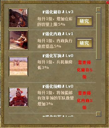 在科技中,玩家可以对内政执行速度、部队战斗力、英雄带兵数、行军速度及掠夺资源数等能力进行研究提高。