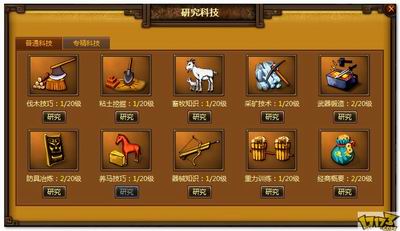 游戏科技分为普通科技和专精科技,选择一种专精科技可以给村庄带来加成。