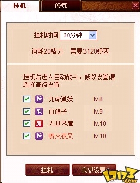 在野外场景可以选择和怪物战斗或挂机。战斗会扣除精力值,当精力点变为0后,获得经验值和道具几率将大幅下降。