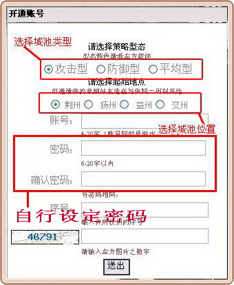 B、点击“开通游戏”后,选择您想要的城池类型以及城池的位置。选好后输入内测账号,自行设定密码,再输入序列号即可开通游戏。