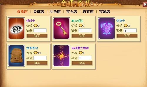 在这里你只能使用金币购买兑换银币的银币卡、开启魔法屋的魔法钥匙、在规定的时间内完全回复伤亡兵力的恢复卡、以及增加背包空间的旅行背包与进行巴别塔高层的星光卷轴。