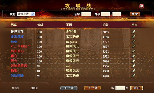 攻城战按照玩家的等级分为四个等级即:新手保护期、初级、中级、高级。处于不同级别的玩家不能互相攻击,只能对其他国家与自己处于统一级别的玩家进行攻击。每次攻击敌方或被敌方攻击都会有战斗报告进行显示,并且会自动加入对方到敌对名单中。