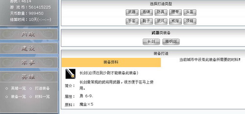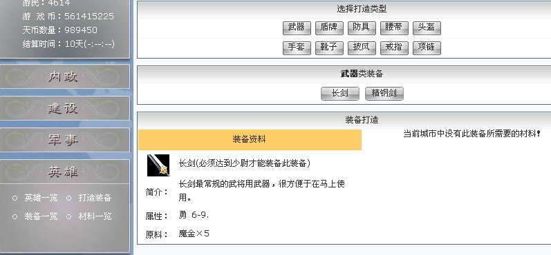 首先我们在游戏页面左方“英雄”选项中,找到“打造装备”一栏,进入后,有十种装备的部件可供选择。打架没有武器怎么行,先打一把称手的长剑,其他部件的打造过程如此复制就行了。