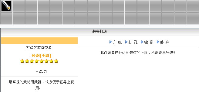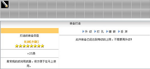 现在我们可以进入“装备一览”这栏,选中刚刚打造的长剑,很清楚的可以看到,原来还有这么多的改造项目呵。由于打孔和镶嵌的功能还在完善中,我们就先来尝试一下升级吧。
