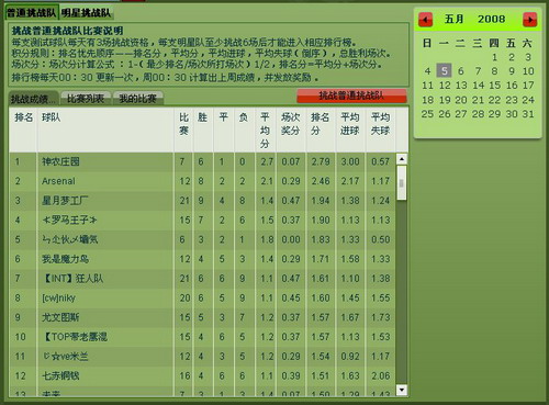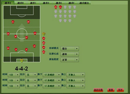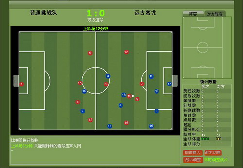 进入比赛界面,就已经看到好多球队在比赛了呢。看来还真是热闹呢。好啦,找个普通的球队先练练手吧!OK,就他吧,谁叫球队的名字就叫普通球队呢,真是没创意的名字。恩,安排好球场战术,表一下给对主给踢下来啊!
