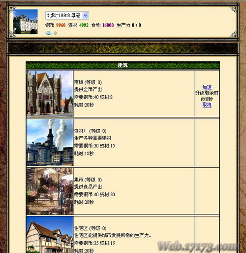 《七海争霸》同样为玩家们提供了建筑所需要的相应资源,包括了铜币、资材、粮食等,同时也充分利用了Internet的在线功能,系统会自动帮玩家收集这些资源,不需要玩家实时在线监控,只需在空闲的时间里,打开浏览器进入游戏,对其进行合理的操作就可以了。