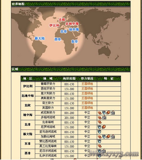 《七海争霸》分为12个地区,每个地区分为若干个区域。除了国家占有的区域,还有大量的中立区域,玩家可以到这些中立区域殖民。不同的区域有不同的生产力和风景,生产力高的地区如:长江流域、黄河流域、威尼斯势力、多瑙河流域等是发展生产的好地方,而西非、新大陆虽然生产力低下,但是黄金产量高,一样受到某些玩家的青睐。因为这些区域是生产型玩家的集结区,港口存有大量生产资源,势必会招来一群又一群的海盗。于是,农民和海盗的战争将在上述区域高密度发生。这种有差异性的地图设计,在同类网页游戏中很少见。