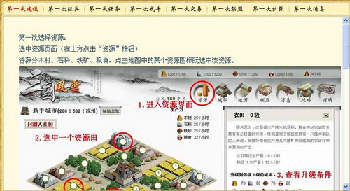 第三步,若干的“第一次”带你初次领略《三国风云》 : “第一次选择资源”、“第一次建设”、“第一次征兵”、“第一次执行攻略任务”…..就是这些第一次,让你对《三国风云》的游戏操作快速熟练起来,完成了上述的学习,你就可以正式踏上《三国风云》的旅程了!