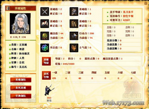 自家的英雄玩家能够自己来培养,通过野外打怪获取相应的经验,每升一级,都会自加一点的个人属性,而玩家可以根据自己的培养目标而选择如何给英雄加点。英雄的基本属性有四个,分别是:攻击,防御,法力及知识,每个属性都会影响到英雄自身的改变,同时也能够影响到作战单位的一些基本属性。