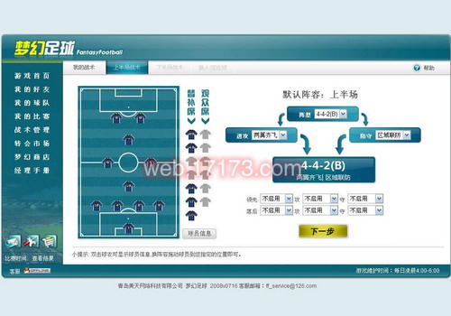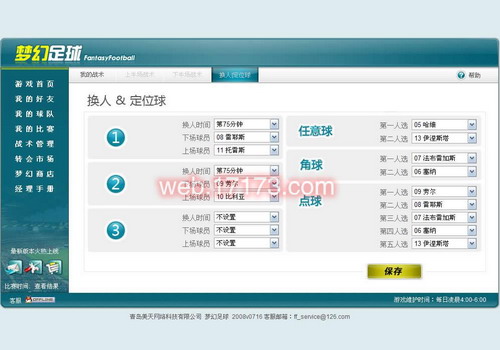 战术管理:游戏已经预先提供了很多套常见的进攻和防守战术给玩家选择组合,还可以设置换人的时间和人选,还有比如角球任意球的主罚球员。同时战术又是有熟练度的,高熟练的战术在实战中就算被对方克制,也可能全身而退,这就使得玩家在加点的时候有所取舍,也避免了一种战术独霸天下的可能,很好的平衡了游戏,提高了竞技性。