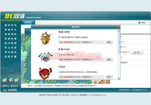 球场建设:可能玩家更关注比赛的胜败,不过作为一个球队的经理,如果不能让球员盈利,也是很失败的呀,在游戏中,不再仅有球票的收入,还可以在球场周围兴建各种设施,比如:“队服专卖店”“礼品店”等等;当然,不止有商业的,还有帮助球队提升战斗力的,比如“战术训练中心:可以获得额外的战术训练点。”