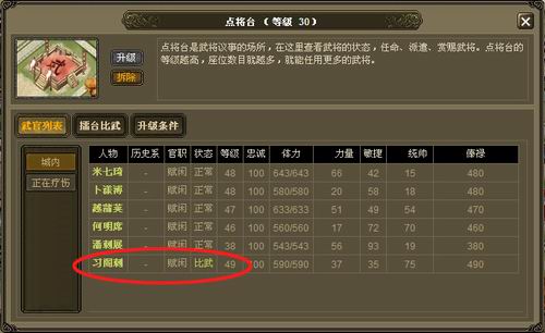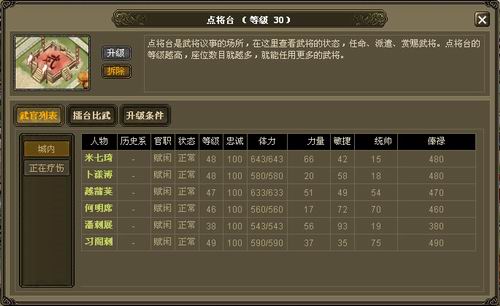 点击“点将台”进行擂台,你可以看到你所有武将的名单,选择你要栽培的武将,点击人物名字进入“人物属性”面板